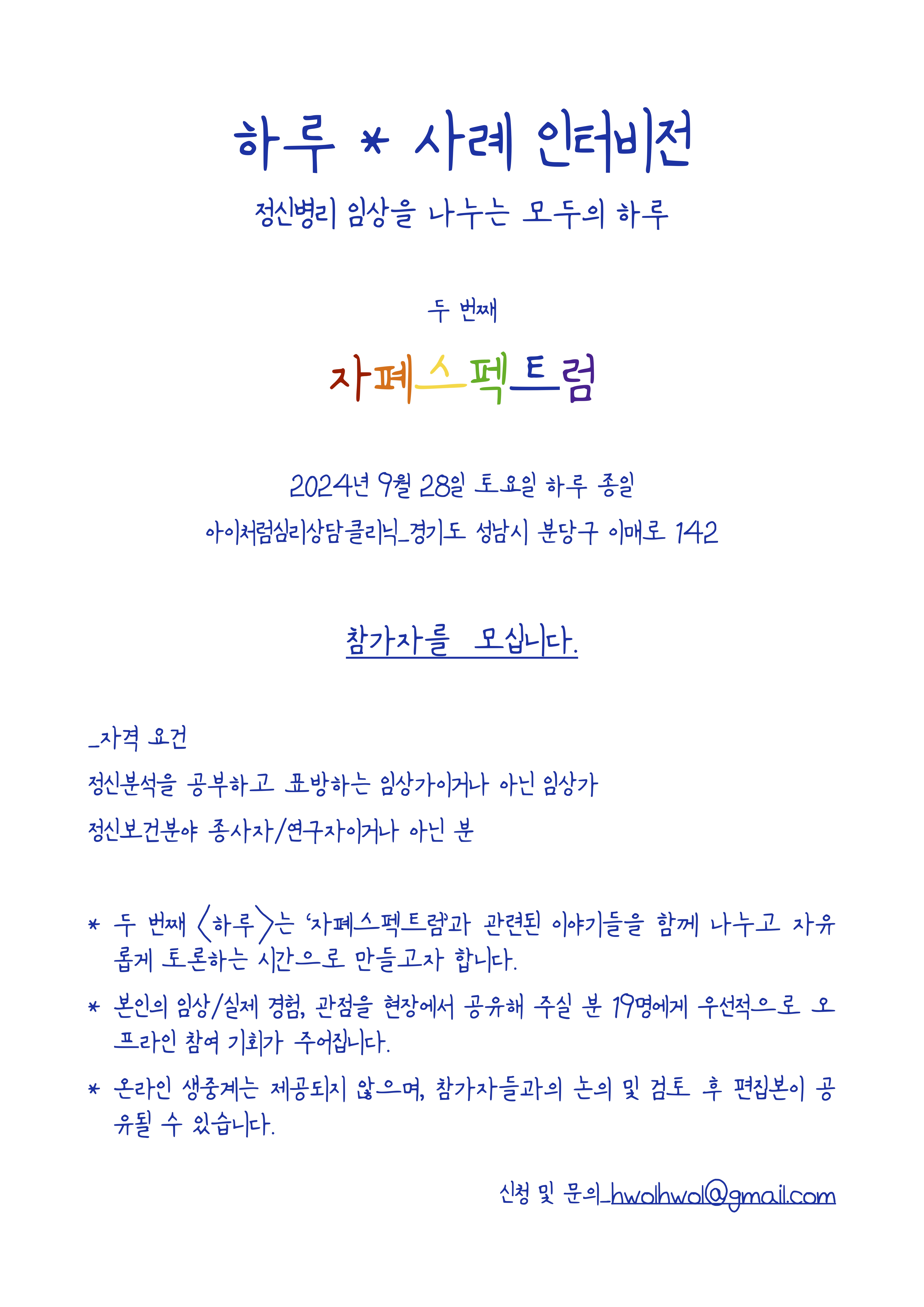 이번 <하루>는 지난 <하루>와는 조금 다르게 연출가와 배우를 따로 두지 않고 오프라인 참가자 모두가 [자폐스펙트럼]에 대해 자유롭게 이야기 나누고 의견을 교환할 수 있는 시간으로 계획하고 있습니다. 물론 원하시는 분께서는 발표를 준비하실 수 있습니다. 임상사례애 대해 깊이 이야기하게 될 것이므로 온라인 생중계는 하지 않을 예정입니다. 추후에 편집본을 대상을 한정하여 공개하게 될 수 있습니다.