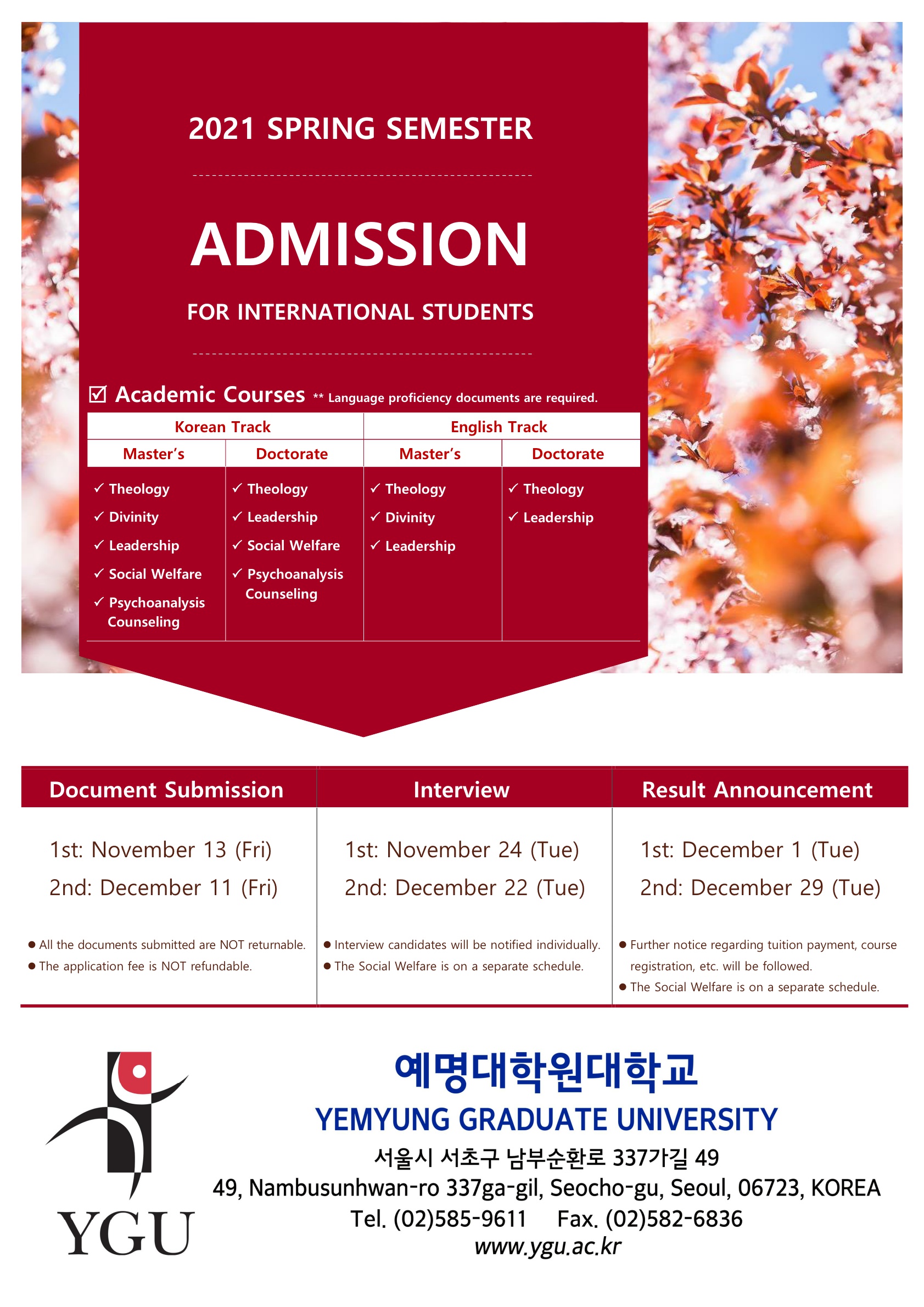 1) 원서 교부 및 제출 마감: 2020년 11월 16일(월)~ 12월 11일(금)