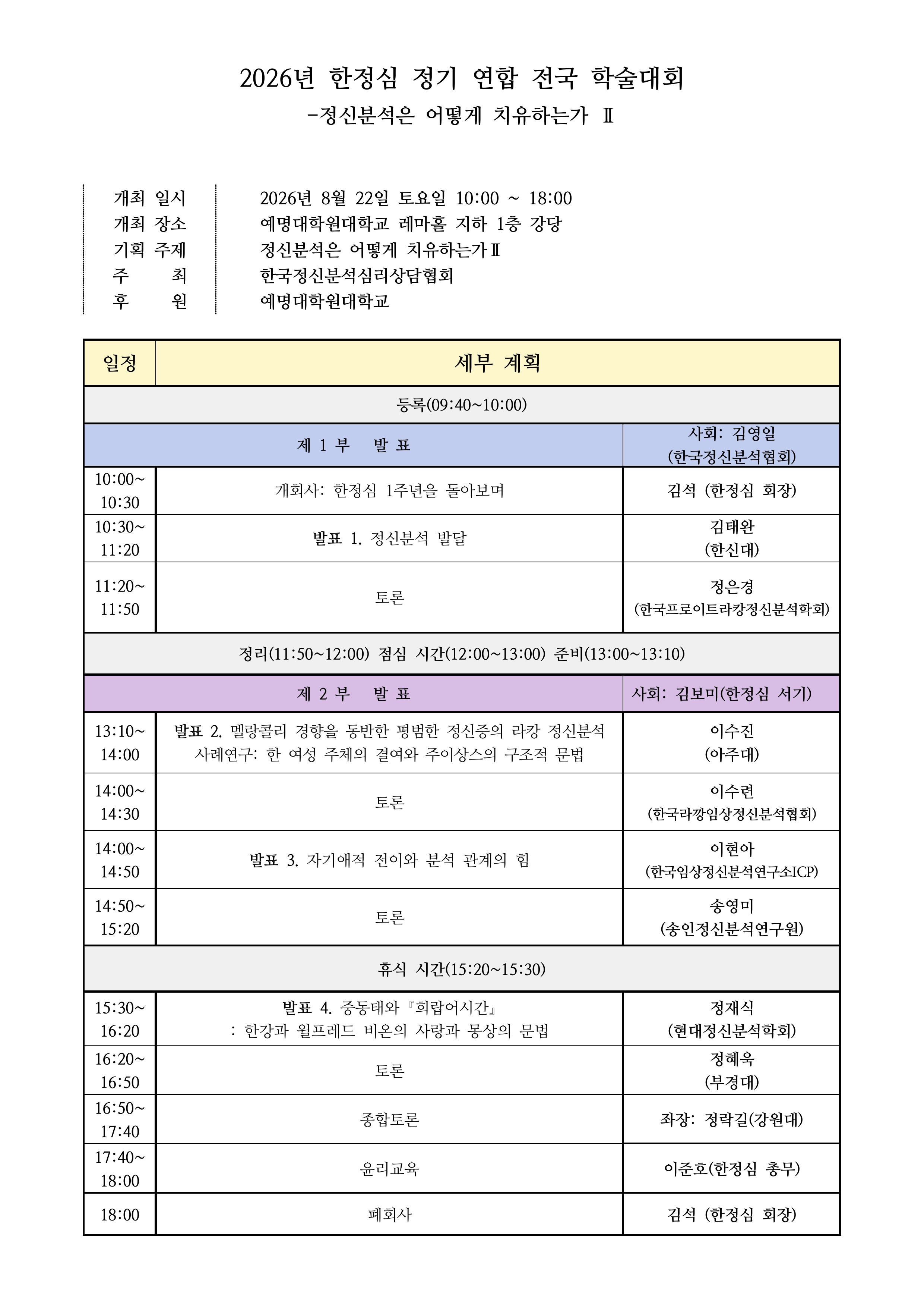 2026년 8월 22일 토요일 오전 10시부터 예명대학원대학교 레마홀 강당(지하)에서 진행될 예정인