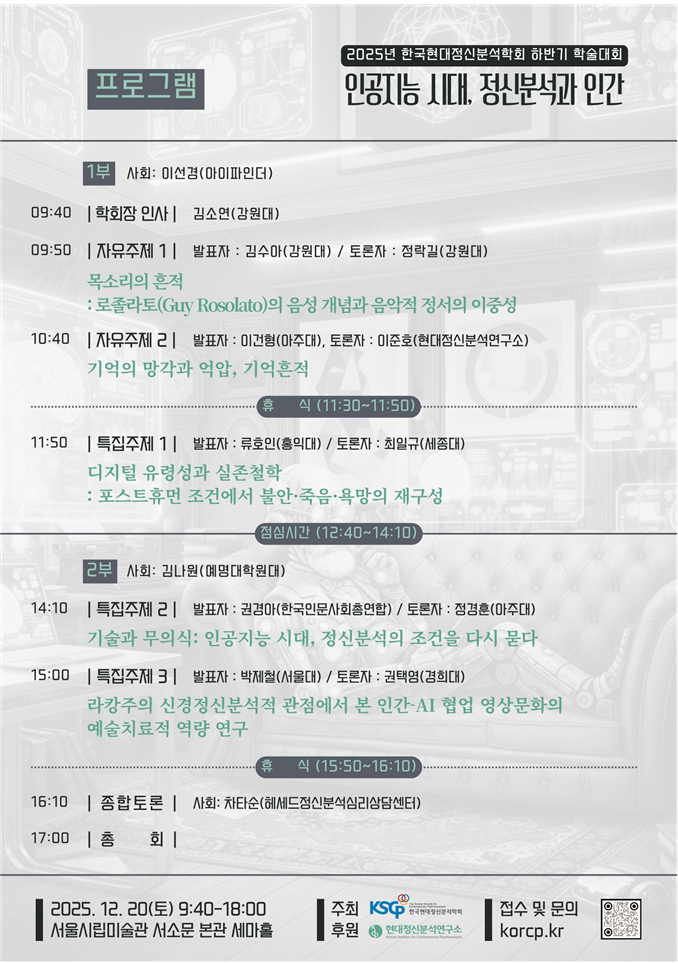 한국현대정신분석학회는 급변하는 기술 문명 속에서 인간의 내면과 정신의 본질을 다시 묻고자, 2025년 하반기 학술대회를 마련하였습니다.