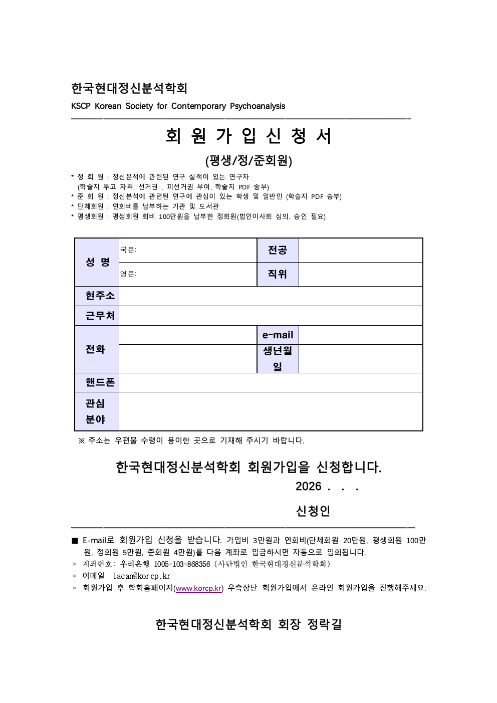 - 2. 정회원 (가입비3만원+연회비5만원=총8만원): 정신분석관련 학술지 논문1편 또는 학위논문1편(석사학위의 경우 보고서가 아닌 석사 논문, 박사 논문) 이상으로 회원가입신청서와 증빙논문이나 증명가능한 링크를 보내주시고, 법인이사회 심의를 거친 후 승인됩니다.